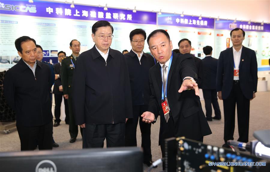 Zhang Dejiang, presidente del Comité Permanente de la Asamblea Popular Nacional (APN), visita a unaexposición sobre los resultados del proyecto de cooperación innovadora militar-civil en Beijing, capital de China, 19 de octubre de 2016.(Xinhua / Ma Zhancheng)