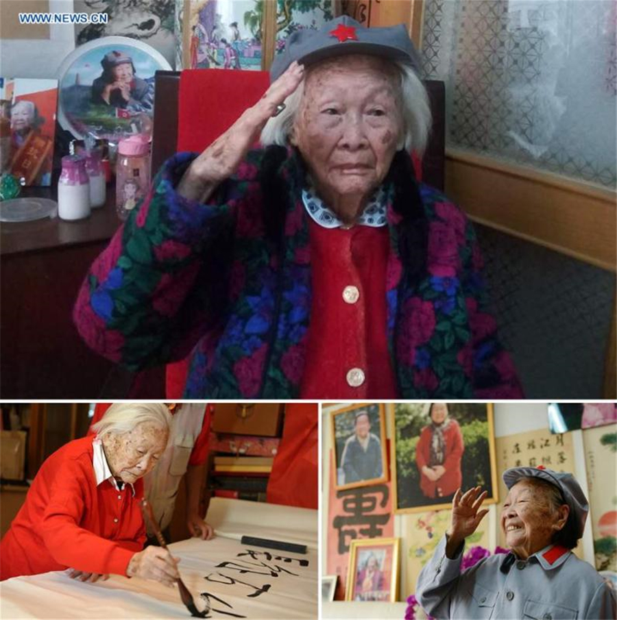 La foto tomada el 10 de octubre del 2016 muestra a Wang Dingguo, de 104 a?os, veterana del Ejército Rojo. Este a?o se cumple el 80 aniversario de la victoria de la Gran Marcha. Wang practica la caligrafía china. [Foto: Xinhua]