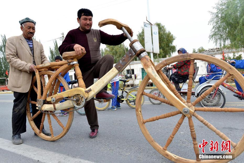Xinjiang,24/10/2016 (El Pueblo en Línea) - Mamatta Sadi, un carpintero de 67 a?os con más de 50 de experiencia, natural del condado Avati en la región autónoma Uigur de Xinjiang, puso a prueba su experiencia creando una bicicleta de madera que ha llamado mucho la atención a los que pasan por delante de su taller. La bicicleta mide 2,8 metros de largo, 1,3 metros de altura, y excepto unas pocas piezas de metal, incluyendo más de 10 tornillos y engranajes, toda la bicicleta está hecha de madera. Sadi tardó más de un mes en finalizar la bicicleta, pero dice que aún no la ha terminado por completo. Tiene la intención de a?adir una campana, neumáticos de goma más adecuados y algunas piezas de hierro para fortalecer la estructura. [Foto: Chinanews.com]