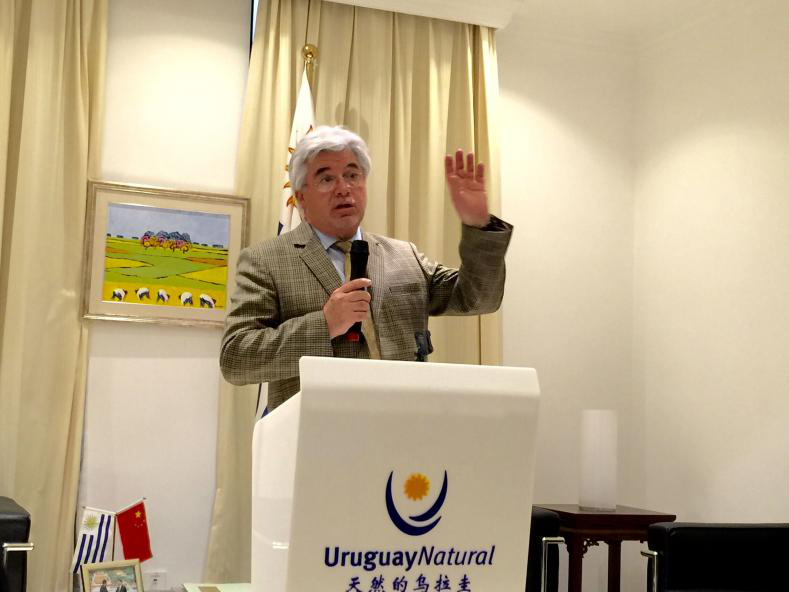 El Ministro de Ganadería, Agricultura y Pesca de Uruguay, Tabaré Aguerre, ofreció una conferencia de prensa en la embajada de Uruguay en China el 25 de octubre.