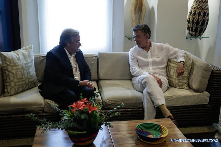 El presidente de Colombia, Juan Manuel Santos (d), participa junto al nuevo secretario general de la Organización de las Naciones Unidas (ONU), António Guterres (i), durante una reunión bilateral en el marco de la XXV Cumbre Iberoamericana de Jefes de Estado y de Gobierno, en Cartagena de Indias, Colombia, el 29 de octubre de 2016. El presidente de Colombia, Juan Manuel Santos, inauguró el sábado oficialmente la XXV Cumbre Iberoamericana de Jefes de Estado y de Gobierno en Cartagena de Indias, Colombia, en la cual los temas propuestos por el anfitrión fueron Juventud, Emprendimiento y Educación. (Xinhua/Jhon Paz)