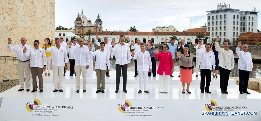 Imagen cedida por la Presidencia de México, del presidente mexicano, Enrique Pe?a Nieto (5-i-frente), posando con mandatarios durante la toma de la fotografía oficial de la XXV Cumbre Iberoamericana de Jefes de Estado y de Gobierno en Cartagena de Indias, Colombia, el 29 de octubre de 2016. El presidente de Colombia, Juan Manuel Santos, inauguró el sábado oficialmente la XXV Cumbre Iberoamericana de Jefes de Estado y de Gobierno en Cartagena de Indias, Colombia, en la cual los temas propuestos por el anfitrión fueron Juventud, Emprendimiento y Educación. (Xinhua/Presidencia de México)