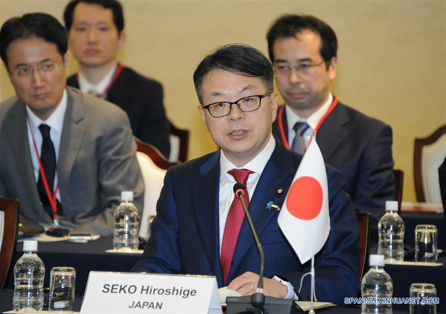 El ministro de Economía, Comercio e Industria de Japón, Hiroshige Seko (frente), pronuncia un discurso durante la 11 Reunión de Ministros de Economía y Comercio entre China, Japón y República de Corea, en Tokio, Japón, el 29 de octubre de 2016. Los ministros de comercio de China, Japón y República de Corea acordaron el sábado fortalecer la cooperación económica y comercial entre los tres vecinos. (Xinhua/Hua Yi)