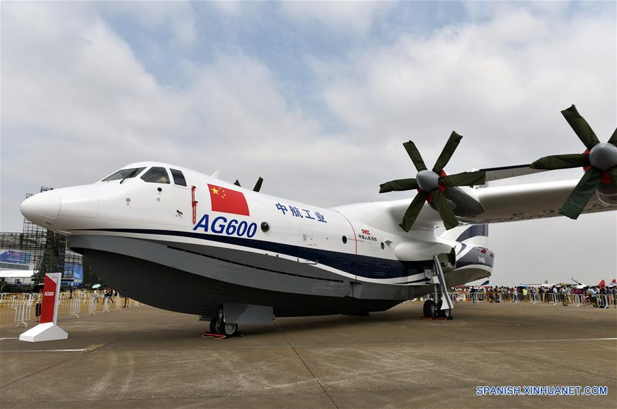 ZHUHAI, octubre 30, 2016 (Xinhua) -- Una aeronave anfibia AG600 es presentada durante la 11 Exhibición Internacional de la Aviación y Aeroespacial de China en Zhuhai, provincia de Guangdong, en el sur de China, el 30 de octubre de 2016. El AG600 es por mucho el avión anfibio más grande del mundo, similar en tama?o al Boeing 737. (Xinhua/Liang Xu)