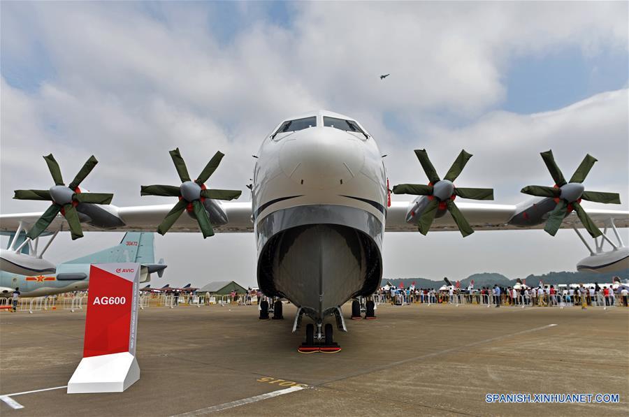 ZHUHAI, octubre 30, 2016 (Xinhua) -- Una aeronave anfibia AG600 es presentada durante la 11 Exhibición Internacional de la Aviación y Aeroespacial de China en Zhuhai, provincia de Guangdong, en el sur de China, el 30 de octubre de 2016. El AG600 es por mucho el avión anfibio más grande del mundo, similar en tama?o al Boeing 737. (Xinhua/Liang Xu)