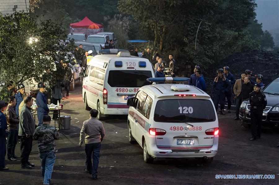 Ambulancias permanecen en la mina de carbón Jinshangou, en el distrito de Yongchuan de Chongqing, en el suroeste de China, el 1 de noviembre de 2016. Los rescatistas están trabajando al máximo para encontrar a los 20 mineros que permanecen atrapados en una mina de carbón en la municipalidad de Chongqing, en el suroeste de China, después de una explosión de gas. Un total de 35 mineros estaban trabajando en el pozo cuando se produjo el accidente. Dos de ellos pudieron escapar ilesos, mientras que 33 quedaron atrapados en un pozo de la mina de carbón Jinshangou, en el distrito de Yongchuan, a las 11:33 de ayer lunes. (Xinhua/Liu Chan)