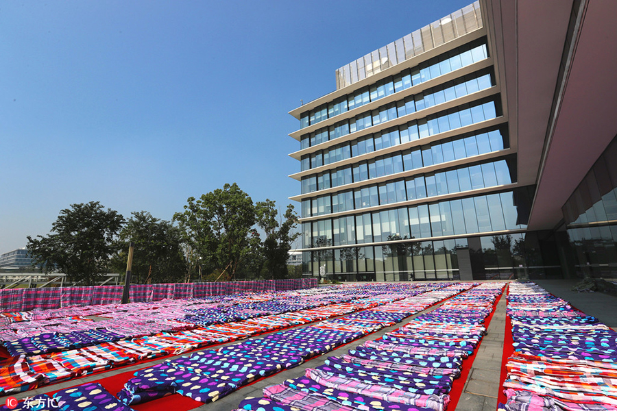 Tres mil edredones se orean en la sede de Alibaba Xixi en Hangzhou, provincia de Zhejiang, el 3 de noviembre de 2016. [Photo / IC]