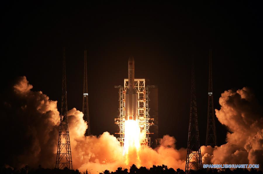 El cohete portador de carga pesada recién desarrollado de China, Gran Marcha-5, despega del Centro de Lanzamiento Espacial de Wenchang, en la provincia de Hainan, en el sur de China, el 3 de noviembre de 2016. El lanzamiento de China el jueves de su cohete portador de carga pesada recién desarrollado, el Gran Marcha-5, desde el Centro de Lanzamiento Espacial Wenchang costero en la provincia de Hainan, sur del país, fue todo un éxito. El cohete despegó alrededor de las 20:43 hora de Beijing. Un funcionario de la misión declaró el éxito del lanzamiento 40 minutos después. (Xinhua/Zhao Yingquan)