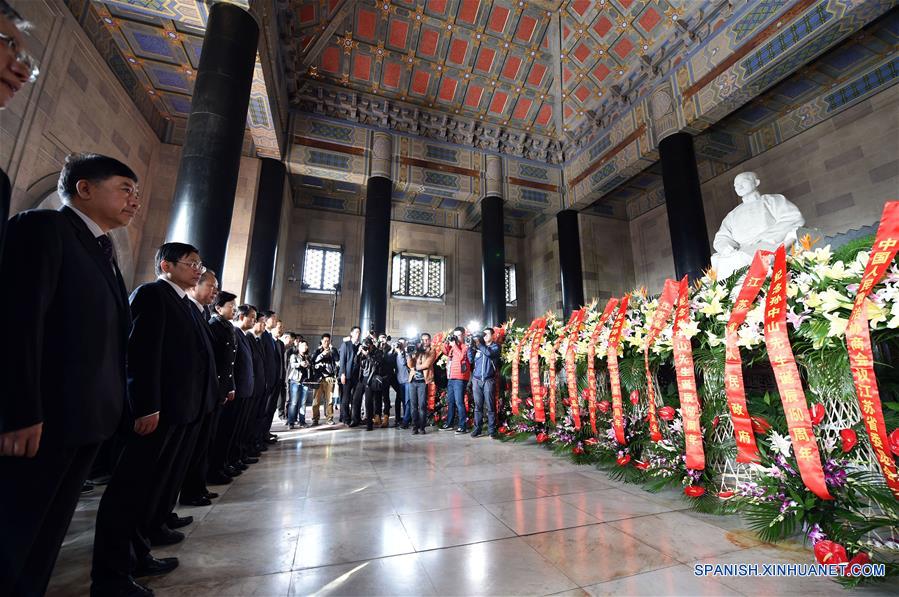 Delegados rinden tributo a la estatua de Sun Yat-sen durante una ceremonia para conmemorar el 150 aniversario de su nacimiento en el Mausoleo de Sun Yat-sen, en Nanjing, capital de la provincia de Jiangsu, en el este de China, el 12 de noviembre de 2016. Nacido en 1866, Sun Yat-sen fue fundador del partido Kuomintang y un venerado líder revolucionario que desempe?ó un papel decisivo en el derrocamiento del gobierno imperial en China. (Xinhua/Sun Can)