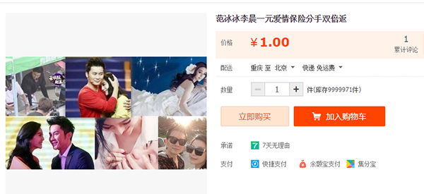 Al pagar un remimbi (15 centavos dólar), aquellos que están interesados pueden obtener un seguro por el amor entre Fan Bingbing y su novio Li Chen. Si rompen los dos, los compradores pueden obtener dos yuanes por cada póliza que adquirieron. Hasta ahora los vendedores no han logrado ninguna transacción exitosa, pero alguien dejó un comentario diciendo: este es un producto excelente.