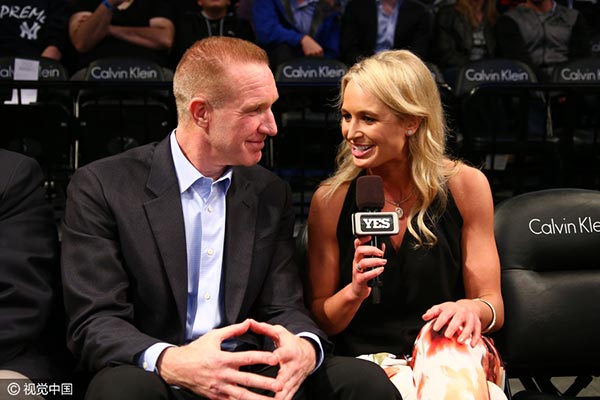El exjugador Chris Mullin es entrevistado por Sarah Kustok durante el partido entre los Chicago Bulls y los Nets de Brooklyn en Nueva York. [Foto: IC]