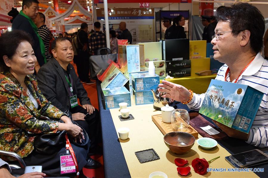 Un comerciante (d) de Taiwan, en el sureste de China, presenta su té durante la 10 Exposición del Té a Través del Estrecho, en Wuyishan, provincia de Fujian, en el suroeste de China, el 16 de noviembre de 2016. La exposición del té de tres días de duración comenzó el miércoles en Wuyishan. (Xinhua/Zhang Guojun)