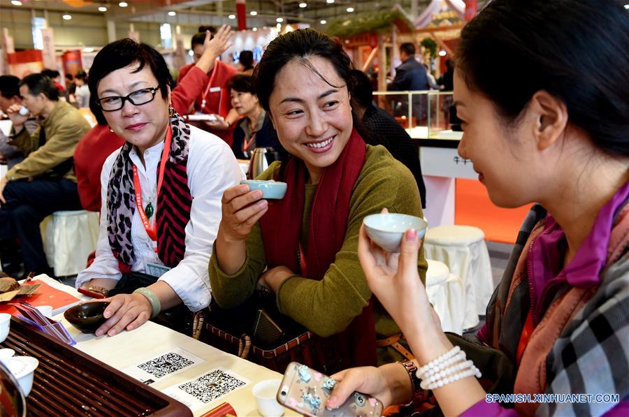 Comerciantes prueban el té y hablan de negocios durante la 10 Exposición del Té a Través del Estrecho, en Wuyishan, provincia de Fujian, en el suroeste de China, el 16 de noviembre de 2016. La exposición del té de tres días de duración comenzó el miércoles en Wuyishan. (Xinhua/Zhang Guojun)