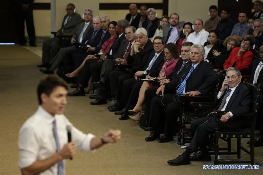 El presidente de Cuba, Raúl Castro (d), escucha mientras el visitante primer ministro de Canadá, Justin Trudeau, imparte una conferencia magistral en la Universidad de La Habana, en la ciudad de La Habana, Cuba, el 16 de noviembre de 2016. El primer ministro de Canadá, Justin Trudeau, impartió el miércoles una conferencia en el Aula Magna de la Universidad de La Habana en presencia del presidente anfitrión, Raúl Castro, en la jornada final de su visita oficial a Cuba. El visitante canadiense, quien llegó la víspera a la isla y sostuvo conversaciones oficiales con Raúl Castro, destacó al inicio de su conferencia el interés de su gobierno en fortalecer los intercambios y lazos de amistad entre ambas naciones, así como fomentar el envío de turistas de su país a Cuba. (Xinhua/Pool)