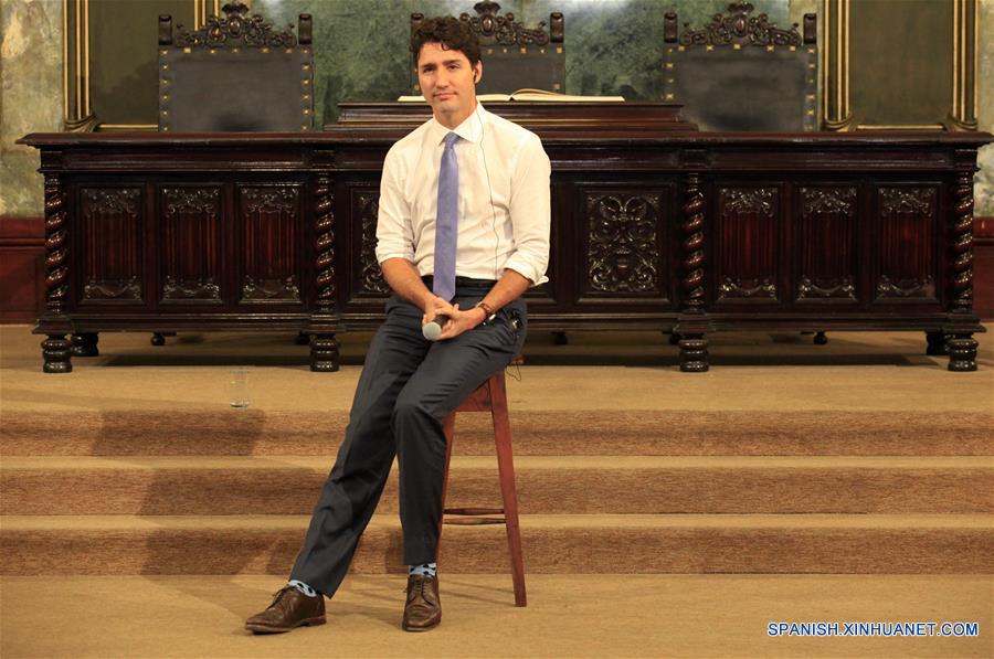 El visitante primer ministro de Canadá, Justin Trudeau, imparte una conferencia magistral en la Universidad de La Habana, en la ciudad de La Habana, Cuba, el 16 de noviembre de 2016. El primer ministro de Canadá, Justin Trudeau, impartió el miércoles una conferencia en el Aula Magna de la Universidad de La Habana en presencia del presidente anfitrión, Raúl Castro, en la jornada final de su visita oficial a Cuba. El visitante canadiense, quien llegó la víspera a la isla y sostuvo conversaciones oficiales con Raúl Castro, destacó al inicio de su conferencia el interés de su gobierno en fortalecer los intercambios y lazos de amistad entre ambas naciones, así como fomentar el envío de turistas de su país a Cuba. (Xinhua/Pool)
