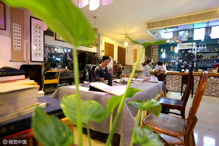 Jinqiu practica pintura con brocha en su cafetería en el condado Guzhen de Bengbu, provincia de Anhui, el 30 de octubre de 2016. [Foto / VCG]