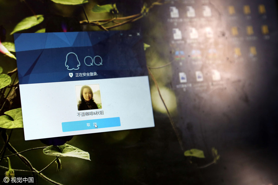 Jinqiu inicia sesión en su cuenta de QQ, a través de la cual conoció a su marido Xiaodong, en el condado Guzhen de Bengbu, provincia de Anhui, el 30 de octubre de 2016. [Foto / VCG]