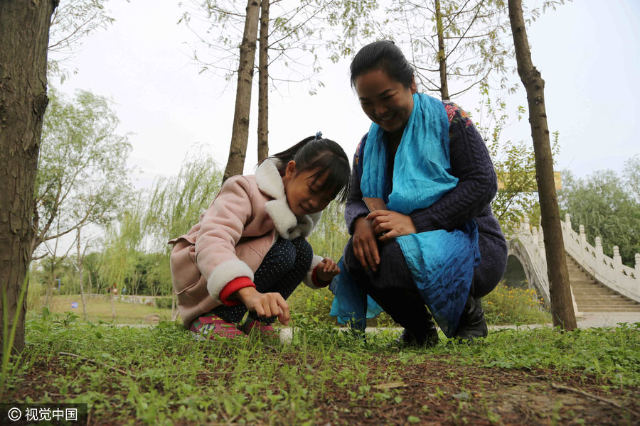 Jinqiu y su hija recogen setas en el condado Guzhen de Bengbu, provincia de Anhui, el 30 de octubre de 2016. [Foto / VCG]