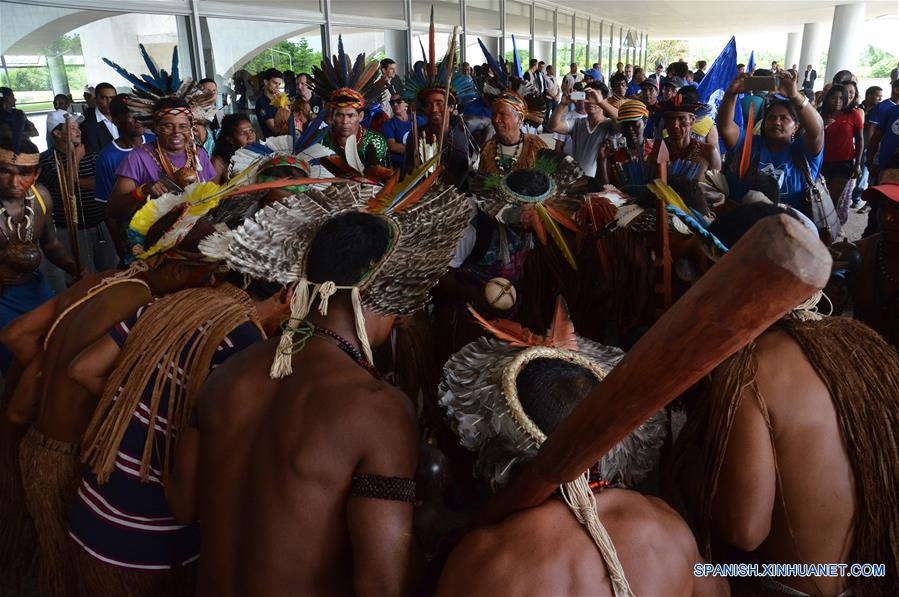 Miembros de las comunidades indígenas, pesqueiras, quilombolas y quebradeiras de coco participan durante una protesta contra la propuesta de enmienda consatitucional PEC 215, frente al Palacio de Planalto, en Brasilia, capital de Brasil, el 22 de noviembre de 2016. Indígenas pertenecientes a diversas etnias acudieron a la entrada principal del Palacio de Planalto en demanda de más recursos para el Instituto Nacional de Colonización y Reforma Agraria (Incra), la Fundación Nacional del Indio (Funai) y el Secretario del Patrimonio de la Unión (SPU). Los manifestantes también de mandaron una mayor autonomía y protagonismo de las comunidades en los procesos de gestión y control de los territorios y áreas de preservación, de acuerdo con información de la prensa local. (Xinhua/Renato Costa/AGENCIA ESTADO)