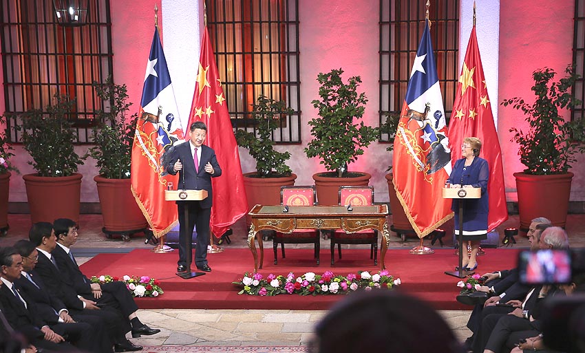 China y Chile acordaron elevar sus lazos bilaterales hasta el nivel de asociación estratégica integral durante la primera visita de Estado del presidente chino, Xi Jinping, a Chile desde que este asumiera su cargo en 2013. (Xinhua/Lan Hongguang)