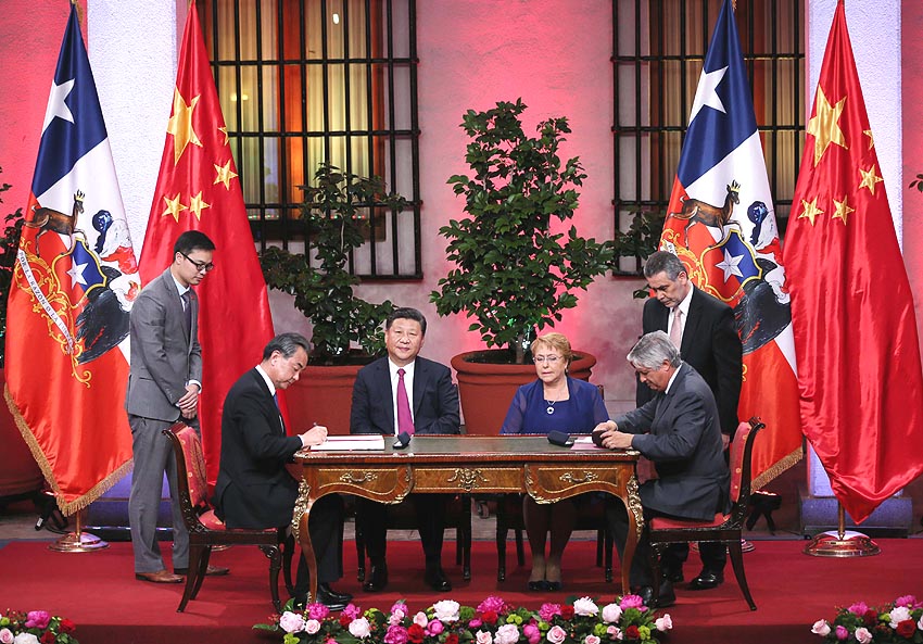 China y Chile acordaron elevar sus lazos bilaterales hasta el nivel de asociación estratégica integral durante la primera visita de Estado del presidente chino, Xi Jinping, a Chile desde que este asumiera su cargo en 2013. (Xinhua/Lan Hongguang)