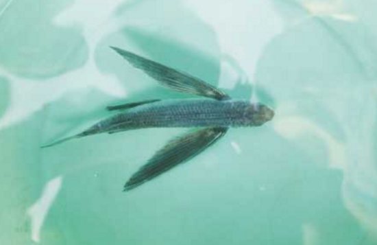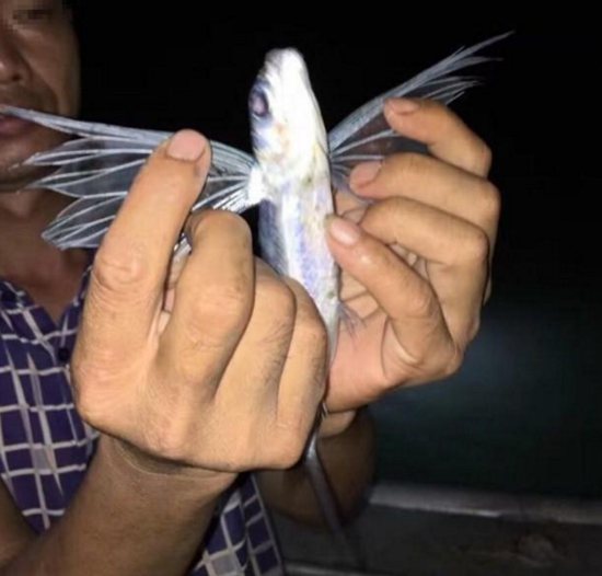 Un pez con dos alas y seis patas fue capturado en Fujian por un pescador aficionado. El pez tiene unos 15 centímetros de largo. Sus "alas" marrones, situadas en el centro de su cuerpo son semitransparentes y más largas que su cuerpo.
