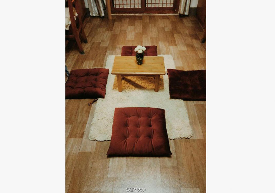 Un dormitorio decorado al estilo japonés e inspirado en "La Gran Ola" de Kanagawa. Universidad Xihua en Chengdu, provincia de Sichuan. [Foto: Weibo de la Universidad Xihua]