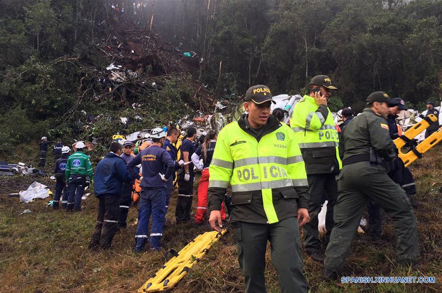 Elementos de seguridad inspeccionan el sitio del accidente del avión que transportaba al equipo de fútbol brasile?o Chapecoense, en el municipio La Ceja, cerca de Medellín, en el departamento de Antioquía, Colombia, el 29 de noviembre de 2016. El accidente del avión en el que murieron al menos 75 personas y que trasladaba al equipo brasile?o Chapecoense, implica "un día trágico para el fútbol", afirmó el martes en la capital paraguaya el presidente de la Conmebol, Alejandro Domínguez. (Xinhua/Policía de Antioquia/COLPRENSA)