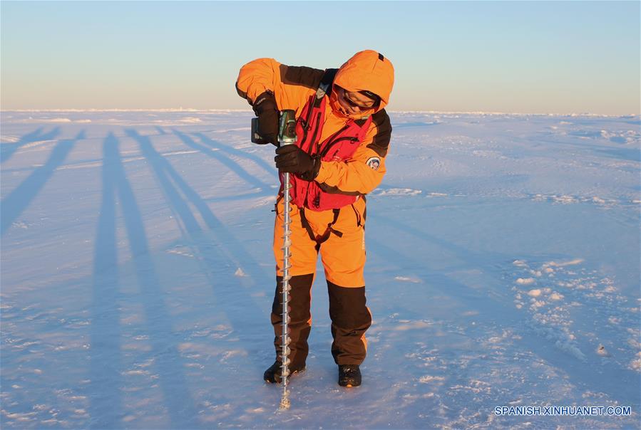 ABORDO DEL XUELONG, noviembre 30, 2016 (Xinhua) -- Un investigador del rompehielos chino Xuelong perfora en la zona de hielo de la Antártida, el 29 de noviembre de 2016. El barco de investigación y rompehielos Xuelong (Dragón de Nieve), el cual se encuentra en su 33 expedición antártica, se detuvo en la zona de hielo a 31km lejos de la estación de Zhongshan. El equipo de la expedición ha comenzado a explorar la manera sobre el hielo para encontrar la forma segura de descargar en Zhongshan. (Xinhua/Rong Qihan)