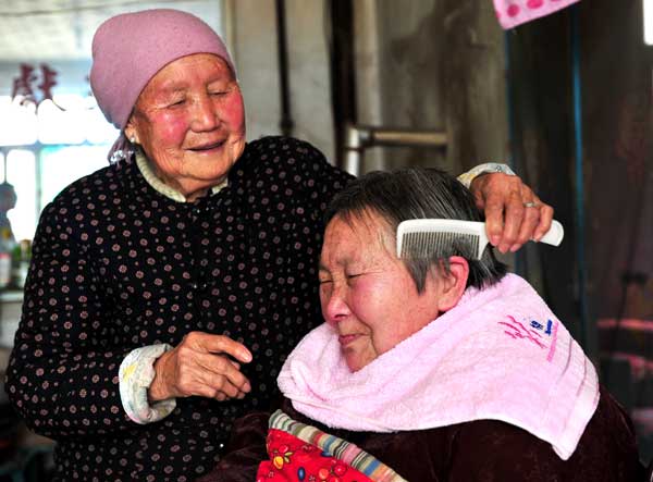 Sun Yincong peina a su nuera Ren Caimei en su casa de Yuncheng, provincia de Shanxi. [Foto: China Daily]