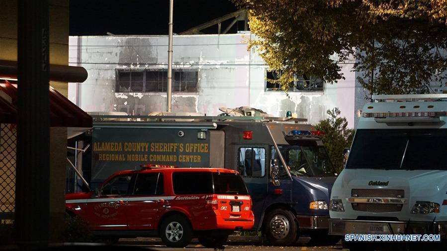 CALIFORNIA, diciembre 4, 2016 (Xinhua) -- Vehículos de rescate permanecen en el sitio de un incendio en un almacén en Oakland, en California, Estados Unidos de América, el 4 de diciembre de 2016. Autoridades de Oakland, en el estado estadounidense de California, confirmaron el domingo que aumentó a 30 la cifra de muertes por un incendio ocurrido el fin de semana. (Xinhua/Xu Yong)