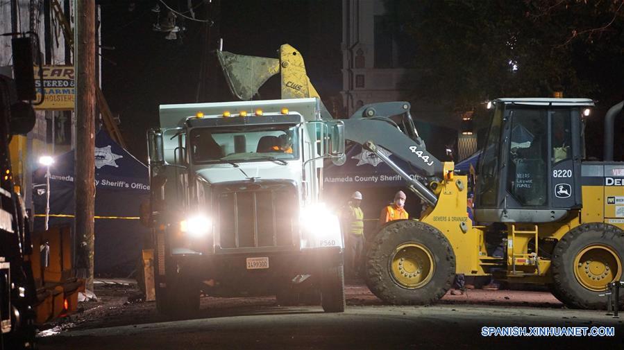 CALIFORNIA, diciembre 4, 2016 (Xinhua) -- Vehículos de rescate permanecen en el sitio de un incendio en un almacén en Oakland, en California, Estados Unidos de América, el 4 de diciembre de 2016. Autoridades de Oakland, en el estado estadounidense de California, confirmaron el domingo que aumentó a 30 la cifra de muertes por un incendio ocurrido el fin de semana. (Xinhua/Xu Yong)