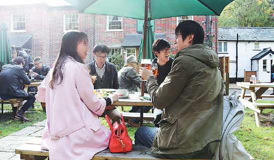 Varios visitantes chinos charlan y toman cerveza en el Plough at Cadsden en Buckinghamshire, una taberna británica que se hizo famoso después de que el presidente Xi Jinping fuera tratado con pescado y patatas fritas y una pinta de cerveza durante su visita de estado el a?o pasado. (Foto: Wu Zhiyi)