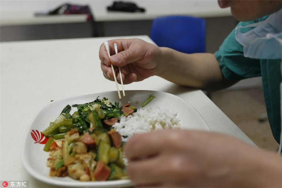 El cirujano Zhou Jianbo come con palitos de algodón en vez de usar palillos en el Hospital Popular de Hunan en la ciudad de Changsha para entrenar sus dedos y hacerlos más ágiles para las cirugías. El doctor Zhou es cirujano jefe adjunto del departamento de cirugía otorrinolaringológica, cabeza y cuello del hospital. Lleva más de dos a?os comiendo con palitos de algodón. A veces también come con la mano no dominante para darle más dificultad a la formación. [Foto/IC]