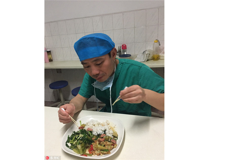 El cirujano Zhou Jianbo come con palitos de algodón en vez de usar palillos en el Hospital Popular de Hunan en la ciudad de Changsha para entrenar sus dedos y hacerlos más ágiles para las cirugías. El doctor Zhou es cirujano jefe adjunto del departamento de cirugía otorrinolaringológica, cabeza y cuello del hospital. Lleva más de dos a?os comiendo con palitos de algodón. A veces también come con la mano no dominante para darle más dificultad a la formación. [Foto/IC]