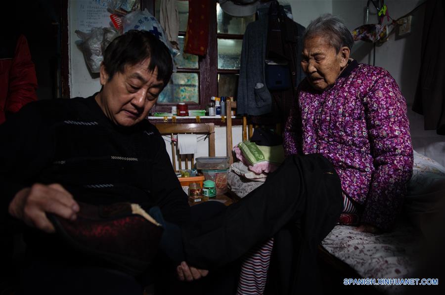 NANJING, diciembre 11, 2016 (Xinhua) -- Imagen del 25 de noviembre de 2016 de Tao Shengfu (i), hijo de Yi Cuilan (d), ayudando a su madre a ponerse zapatos en su casa en Nanjing, en la provincia de Jiangsu, en el este de China. Yi Cuilan, nacida el 6 de mayo de 1923, sobrevivió a la invasión de las tropas japonesas al pretender ser un ni?o, buscando asilo en distintos campos de refugiados. A pesar de haber escapado a la muerte, sufre de dolores severos debido a un brutal ataque de los invasores japoneses. Las tropas japonesas ocuparon Nanjing, en el este de China, el 13 de diciembre de 1937, y comenzaron una masacre de seis semanas. Los registros chinos muestran que más de 300,000 personas, no sólo soldados desarmados sino también civiles, fueron brutalmente asesinadas y miles de mujeres fueron violadas. En los últimos 79 a?os, el número de sobrevivientes ha disminuido. Después de que Zhang Fuzhi, de 89 a?os, falleciera el 26 de noviembre de 2016, el número de sobrevivientes registrados se redujo a 108. Con heridas que no se pueden sanar, y el trágico recuerdo del sufrimiento, los sobrevivientes son los testigos de la masacre. (Xinhua/Li Xiang)