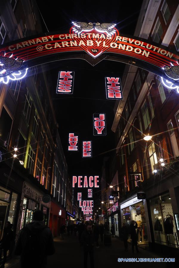LONDRES, diciembre 13, 2016 (Xinhua) -- Personas caminan debajo de luces navide?as encendidas en una calle del centro de Londres, capital de Reino Unido, el 13 de diciembre de 2016. (Xinhua/Han Yan)