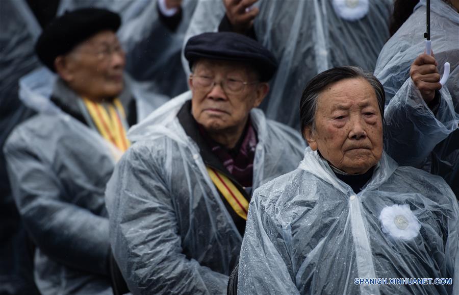NANJING, diciembre 13, 2016 (Xinhua) -- Xia Shuqin (d), un sobreviviente de la Masacre de Nanjing, asiste a la ceremonia memorial estatal para celebrar el Día Nacional Conmemorativo por las Víctimas de la Masacre de Nanjing, en el Salón Memorial de las Víctimas de la Masacre de Nanjing por los Invasores Japoneses, en Nanjing, en la provincia de Jiangsu, en el este de China, el 13 de diciembre de 2016. (Xinhua/Li Xiang)