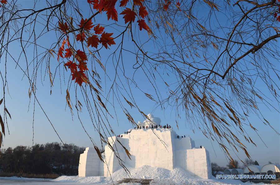 HEILONGJIANG, diciembre 14, 2016 (Xinhua) -- Trabajadores tallan una escultura de nieve en el Parque Internacional de Exposiciones de Escultura de Nieve Isla del Sol, en Harbin, capital de la provincia de Heilongjiang, en el noreste de China, el 14 de diciembre de 2016. La talla de un mu?eco de nieve de 34 metros de altura comenzó el martes en el parque en Harbin y se estima que será finalizada el 20 de diciembre. (Xinhua/Wang Jianwei)