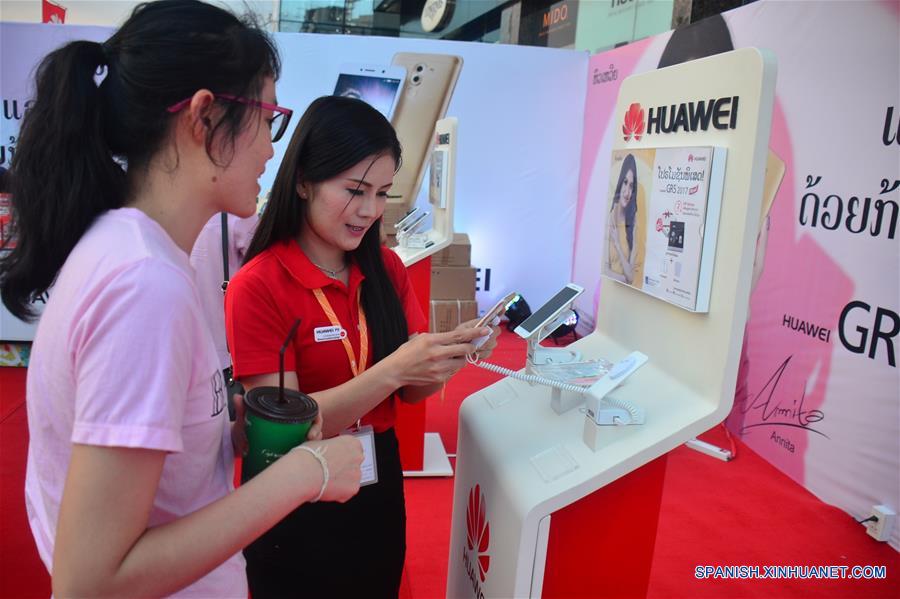 VIENTIAN, diciembre 18, 2016 (Xinhua) -- Imagen del 17 de diciembre de 2016, de una empleada presentando a una clienta un teléfono inteligente Huawei en Vientián, Laos. La empresa Huawei introdujo el teléfono Huawei GR5 2017 al mercado de Laos el sábado, en Vientián. (Xinhua/Liu Ailun)