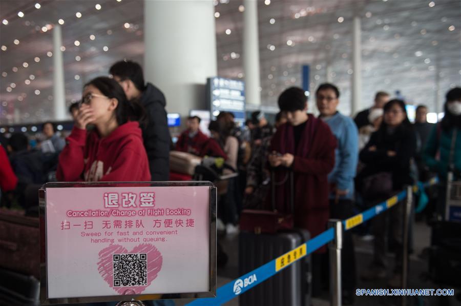 BEIJING, diciembre 20, 2016 (Xinhua) -- Pasajeros esperan en una fila para la cancelación o cambio de reservaciones de vuelos, en el Aeropuerto Internacional Capital de Beijing, en Beijing, capital de China, el 20 de diciembre de 2016. El pesado esmog del lunes por la noche a las primeras horas de martes ha causado demoras y cancelaciones de vuelos en el aeropuerto. (Xinhua/Luo Xiaoguang)