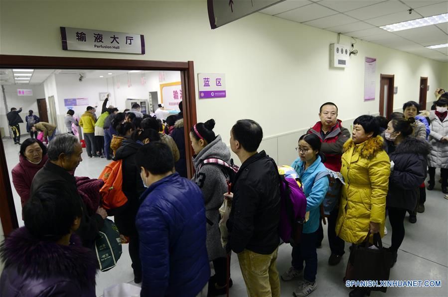 SHANDONG, diciembre 20, 2016 (Xinhua) -- Padres esperan en una fila para que sus hijos vean al doctor por enfermendades respiratorias en un hospital en Jinan, capital de la provincia de Shandong, en el este de China, el 20 de diciembre de 2016. El pesado esmog persistió el martes en Beijing, Tianjin y las provincias de Hebei, Henan y Shandong. Más de 20 ciudades han emitido alertas rojas por el esmog. (Xinhua/Zhao Xiaoming)