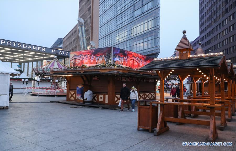 Personas caminan por un mercado navide?o que permanece cerrado en la Potsdamer Platz en Berlín, capital de Alemania, el 20 de diciembre de 2016. Al menos 12 personas murieron y muchas otras resultaron heridas luego que un camión remolque cargara sobre una multitud en un mercado de Navidad el lunes por la noche en Berlín. (Xinhua/Shan Yuqi)