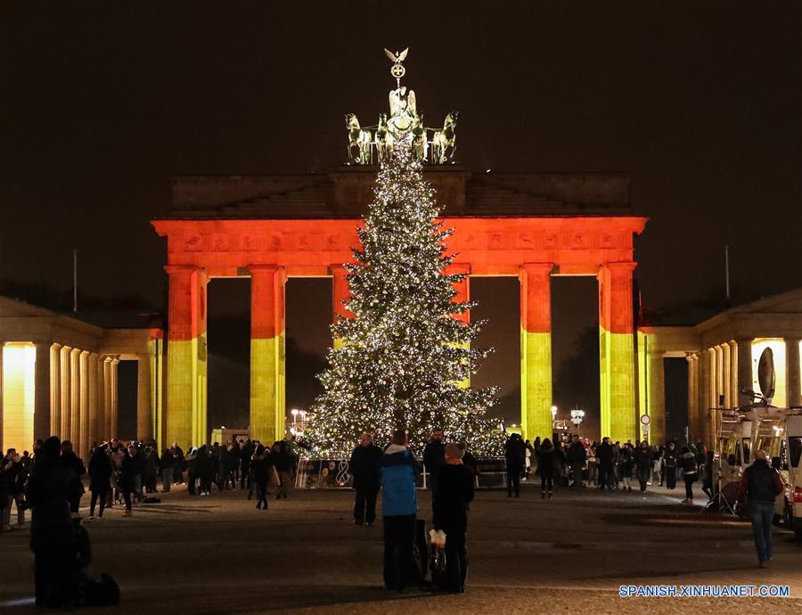 Personas permanecen frente a la Puerta de Brandeburgo, iluminada con los colores de la bandera nacional de Alemania en memoria de las víctimas de un ataque a un mercado de Navidad, en Berlín, capital de Alemania, el 20 de diciembre de 2016. Al menos 12 personas murieron y muchas otras resultaron heridas luego que un camión remolque cargara sobre una multitud en un mercado de Navidad el lunes por la noche en Berlín. (Xinhua/Shan Yuqi)