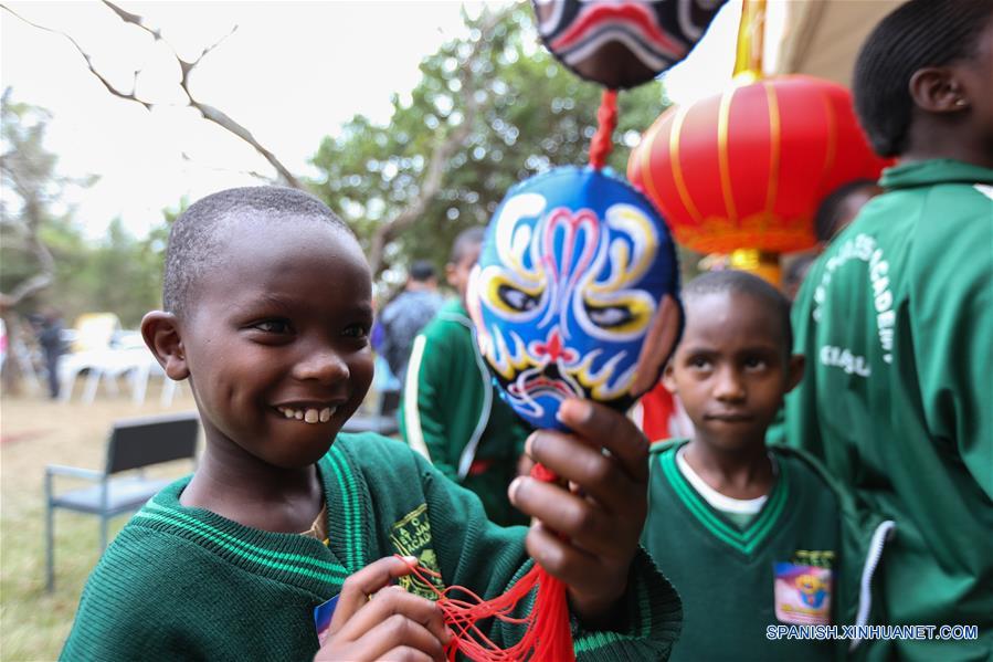 Un ni?o jugaba con una máscara de ópera de Pekín en una actividad para celebrar el festival de Medio Oto?o en el Instituto Confucio en Nairobi, Kenia el 15 de septiembre del a?o presente. (Xinhua/Pan Siwei)