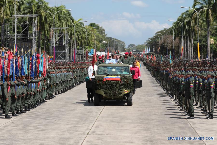 CARABOBO, diciembre 28, 2016 (Xinhua) -- Imagen cedida por la Presidencia de Venezuela, del presidente venezolano, Nicolás Maduro, a bordo de un vehículo militar inspeccionando las tropas durante un evento de fin de a?o llevado a cabo en el Campo Carabobo en el estado Carabobo, Venezuela, el 28 de diciembre de 2016. De acuerdo con información de la prensa local, el presidente venezolano, Nicolás Maduro, inauguró el miércoles en el marco de su mensaje de salutación de fin de a?o para los integrantes de la Fuerza Armada Nacional Bolivariana (FANB), el Batallón "24 de junio" de la Guardia de Honor Presidencial, el cual cuenta con 800 integrantes de la guardia de honor así como áreas de recreación y entrenamiento militar, canchas deportivas y anfiteatro. (Xinhua/Presidencia de Venezuela)