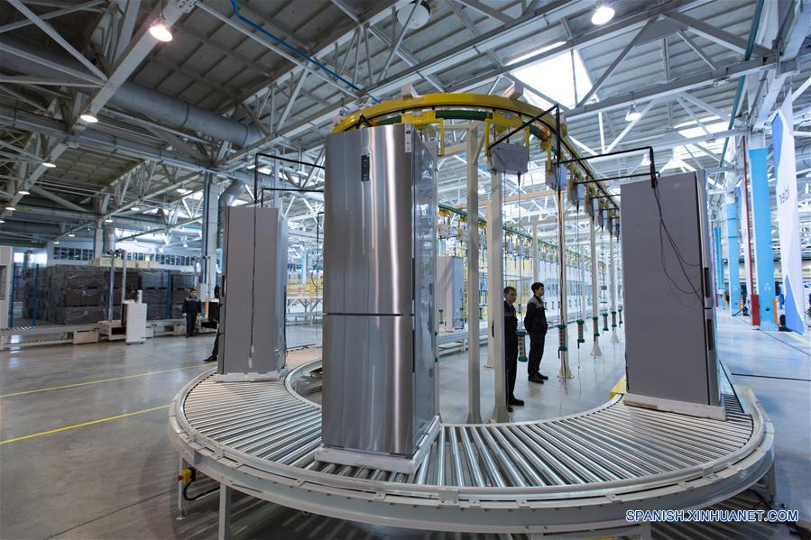 La foto presenta la base de fabricación de refrigerador de la marca china Haier en Rusia el 22 de abril. (Xinhua/Bai Xueji)