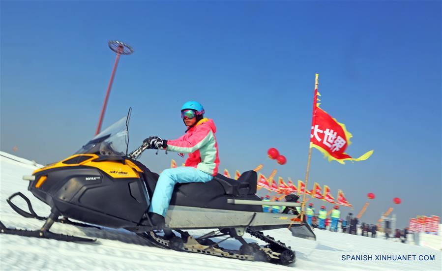 Un turista conduce una motonieve durante el 2 Festival Internacional de Hielo, Nieve y Aguas Termales de Jinzhou, en Jinzhou, provincia de Liaoning, en el noreste de China, el 3 de enero de 2017. (Xinhua/Yang Qing)