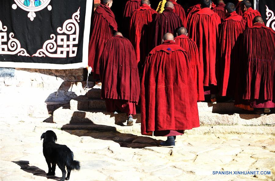 Imagen del 2 de enero de 2017 de monjes caminando en el pasillo asistir a un ensablaje de dharma en la lamasería Jiangsi en el condado de Qushui de Lhasa, capital de la región autónoma del Tíbet, en el suroeste de China. Más de 200 monjes de la lamasería y otros templos participaron el lunes en el ensablaje de dharma. (Xinhua/Chogo)