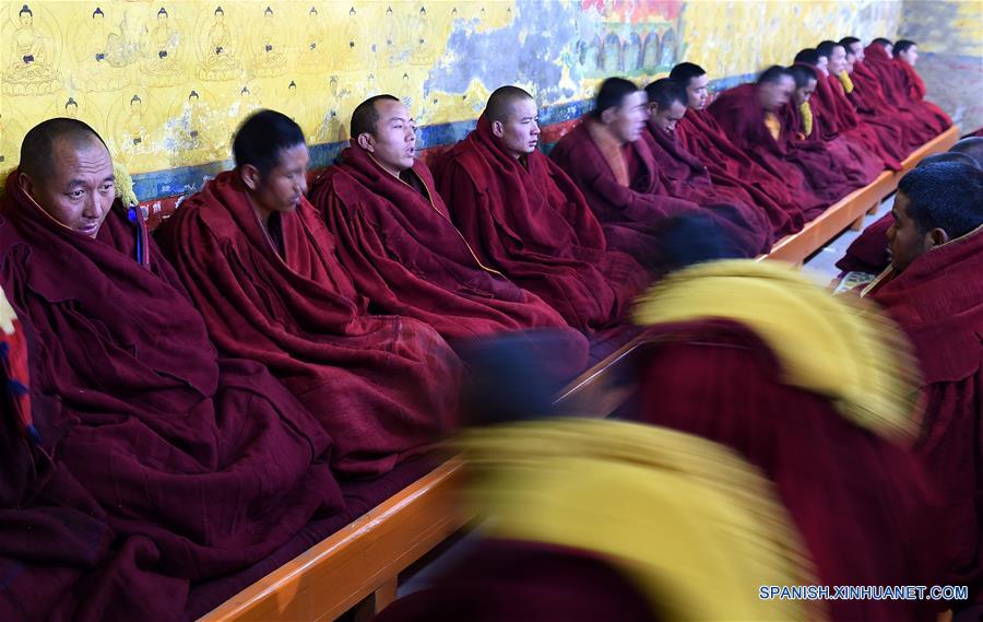 Imagen del 2 de enero de 2017 de monjes asistiendo a un ensablaje de dharma en la lamasería Jiangsi en el condado de Qushui de Lhasa, capital de la región autónoma del Tíbet, en el suroeste de China. Más de 200 monjes de la lamasería y otros templos participaron el lunes en el ensablaje de dharma. (Xinhua/Chogo)